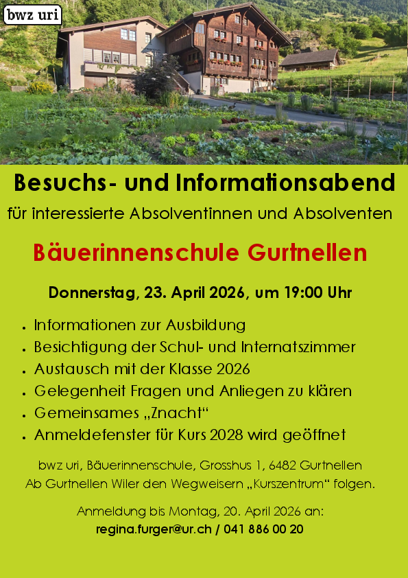 An der Bäuerinnenschule Gurtnellen des bwz uri lernen jeweils 18 Frauen und Männer, wie ein Bauernhaushalt effizient und ökologisch geführt wird. Die angebotene Ausbildung Bäuerin/bäuerlicher Haushaltsleiter FA ist vielseitig und praxisnah. Eigene Kompetenzen und Erfahrungen sollen eingebracht und ausgetauscht werden. Neue Ideen von bereits Praktizierenden und auch Quereinsteiger in der Landwirtschaft sind stets willkommen!